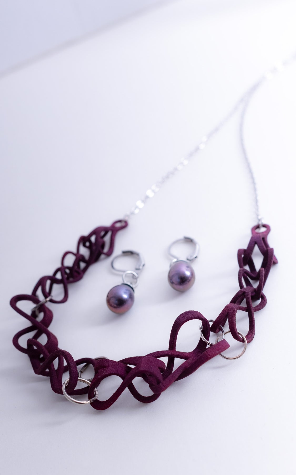 Ensemble collier bordeaux en nylon 3D avec chaîne argentée et boucles d’oreilles perles goutte aubergine présenté avec écrin noir